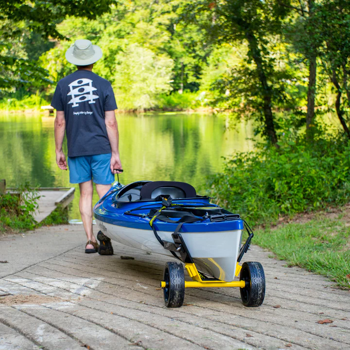 - use a kayak cart. A kayak cart is basically a wheeled cradle that carries all the weight, so you can tow the boat instead of carrying it. They’re easy to assemble and many are designed to break down and store in your kayak while you paddle. Suspenz is the originator of the kayak cart and continues to lead the way with kayak carts that fit any kayak.